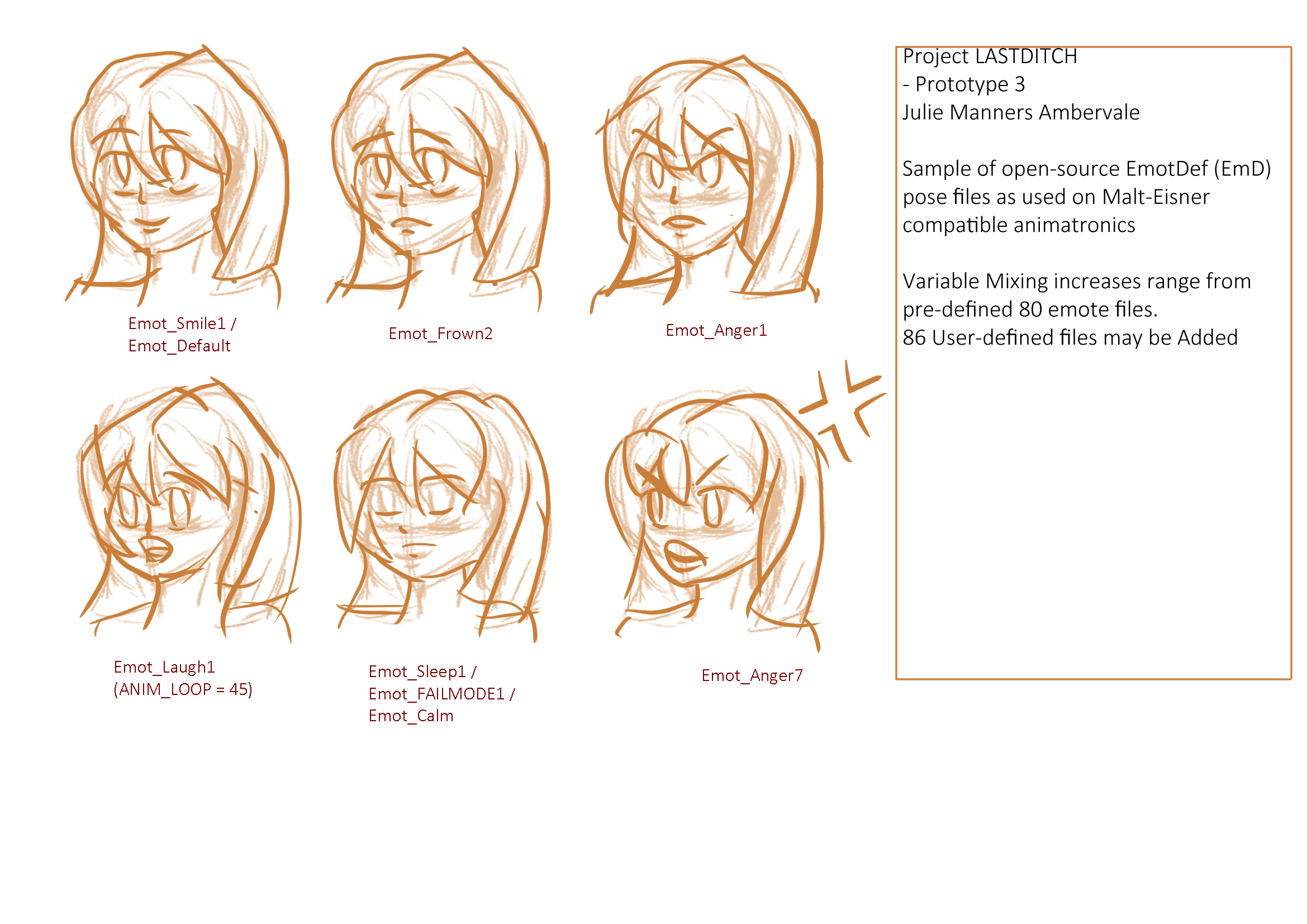 Sample Sheet 1 of 2 from EmoteDef Pose Testing on Malt-Eisner compatible Animatronic Facial Controller.